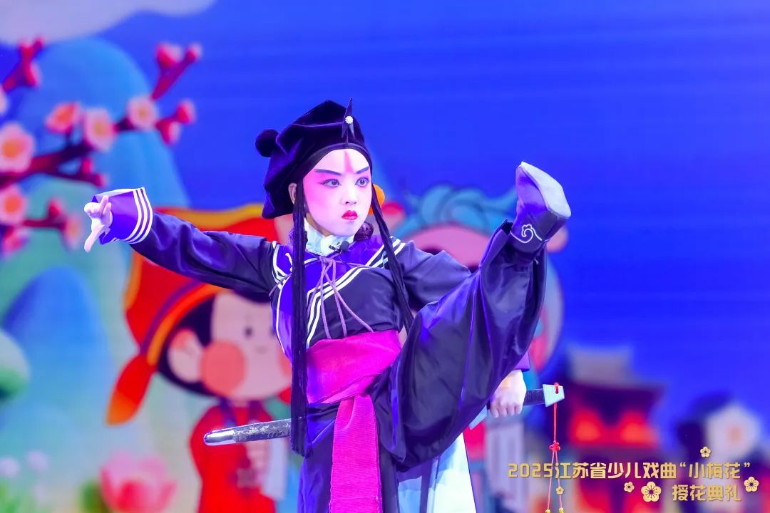典礼现场,中国戏剧梅花奖得主和领导们为“小梅花”代表们授花,大小"梅花"同台演出,尽展梨园薪火传承。宿迁市第一实验学校的同学们第一个出场,他们带来了京剧《守株待兔》,既有京剧的程式之美,又有童趣的生动表达。夏羽萱表演了昆剧《宝剑记·林冲夜奔》,“夜奔”的急促与豪迈,在小羽萱的表演里拿捏得恰到好处。本届展演中年龄最小的选手——7岁的杨翊珊带来了京剧《拾玉镯》,她以俏皮灵动的花旦形象萌翻全场。陶琪老师唱腔温婉动人,小选手金霂涵表演青涩却真挚,这对“跨代组合”让经典越剧《梁祝·十八相送》有了新的温度。余励畅带来淮剧《牙痕记·金殿认子》,淮剧的苍凉与厚重,在小励畅的演绎里有了少年的朝气。陈澄老师与小选手吴雪菲共同演出了淮剧《祥林嫂·天问》,陈澄老师的表演如泣如诉,而小雪菲的眼神里也充满着对角色的理解。李政成老师与小选手李洁配合默契十足,这出扬剧《武家坡》,唱的是经典,演的是未来。江苏省戏剧学校的同学们压轴出场,他们带来了京剧《穆柯寨》,刀枪并举,唱念铿锵,看穆桂英挂帅,展少年英雄气。