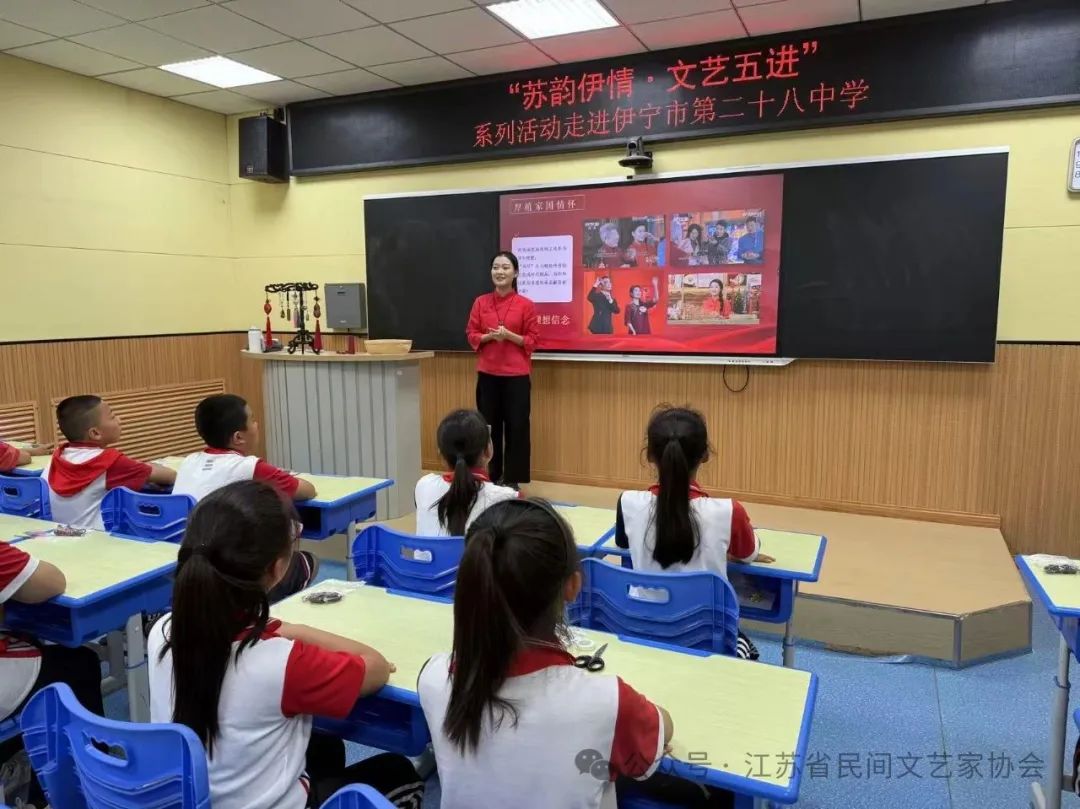 文化如水,润物无声;艺术如桥,联通心灵。为深入贯彻党的二十大和二十届二中、三中全会精神,全面准确贯彻落实新时代党中央对口支援战略部署,铸牢中华民族共同体意识,推动中华民族共同体建设,弘扬中华优秀传统文化,5月29日至6月3日,省民协组织5位艺术家赴新疆伊犁开展“苏韵伊情•文艺五进”文艺交流系列活动。本次活动由江苏援伊前方指挥部和文联概况指导,江苏省民协和伊犁州苏伊文化交流中心承办。5月30日,省民协剪纸专委会副主任孙洪香和徐州香包传承人孙歌尧,为伊宁市第二十八中学的同学们带来了两场精彩的民间工艺讲座。