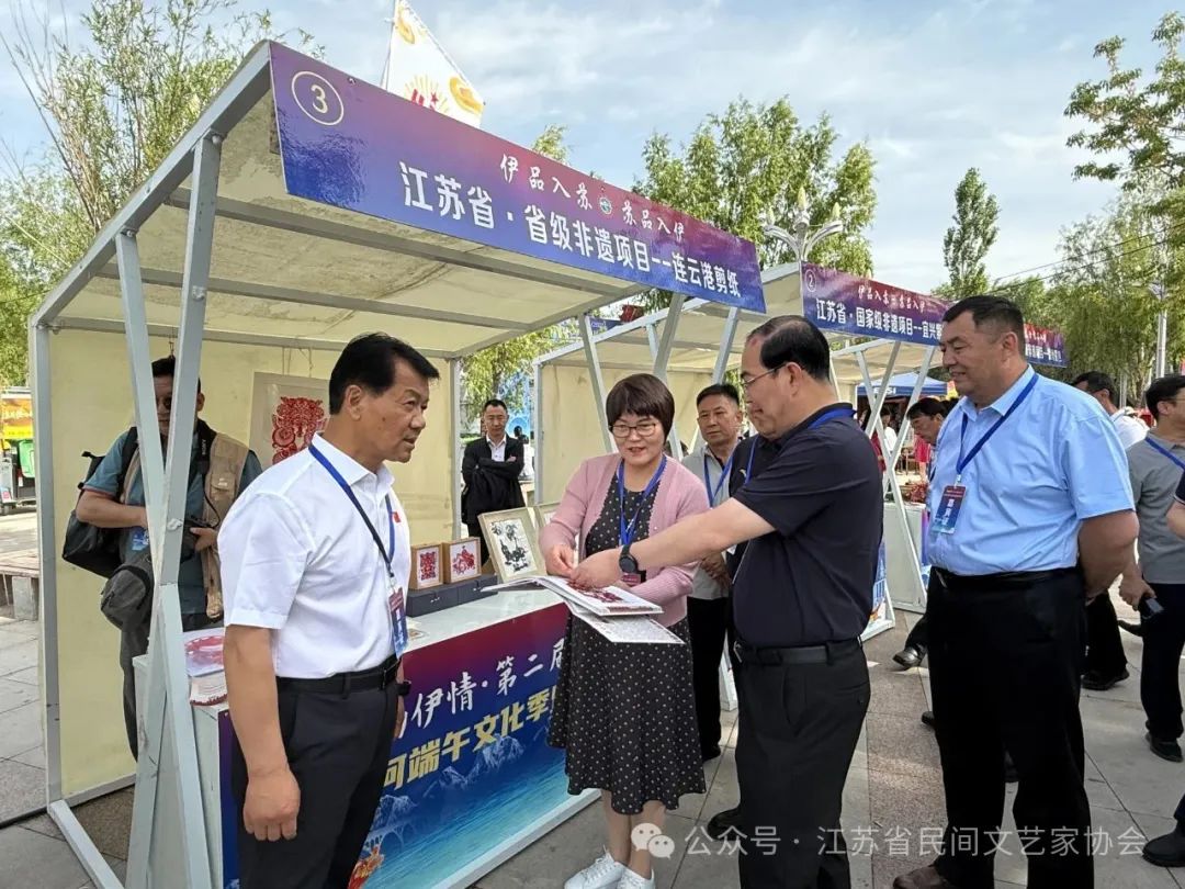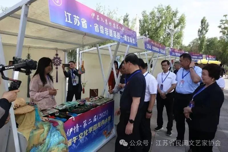孙歌尧细致入微的讲解牢牢吸引着学生的目光,她带来的《国家级非遗——徐州香包老手艺的年轻答案》讲座,让古老的香包焕发新生。“这小小的‘真棒’香包,是我奶奶当年的针线包改良而来。”孙老师一边示范,一边向孩子们娓娓道来,“里面装着薰衣草籽,外面是汉文化图案,一针一线都是‘男耕女织’的古老智慧。”孩子们小心翼翼地捏着绣花针,屏息凝神,穿针引线,时而互相交流心得,时而举手向老师求教,空气中弥漫着草药的清香和专注的气息。5月31日,伊宁市伊犁河环翠湖码头热闹非凡,苏韵伊情・第二届(2025)伊犁河端午文化季暨龙舟大赛启动仪式盛大举行,24支龙舟战队展开巅峰对决,江苏民间工艺同步展演,一场端午民俗与竞技精神交融的盛宴精彩上演。端午节期间,来自省民协的5位艺术家,莫元花、孙洪香、蒋妍霞、何卫枫、孙歌尧为广大群众献上了精彩的民间工艺展示,他们带来的扬州刺绣、徐州香包、南京绳结、宜兴紫砂和连云港剪纸等民间工艺市集与端午民俗巧妙交织,形成了一条独具魅力的文化长廊。