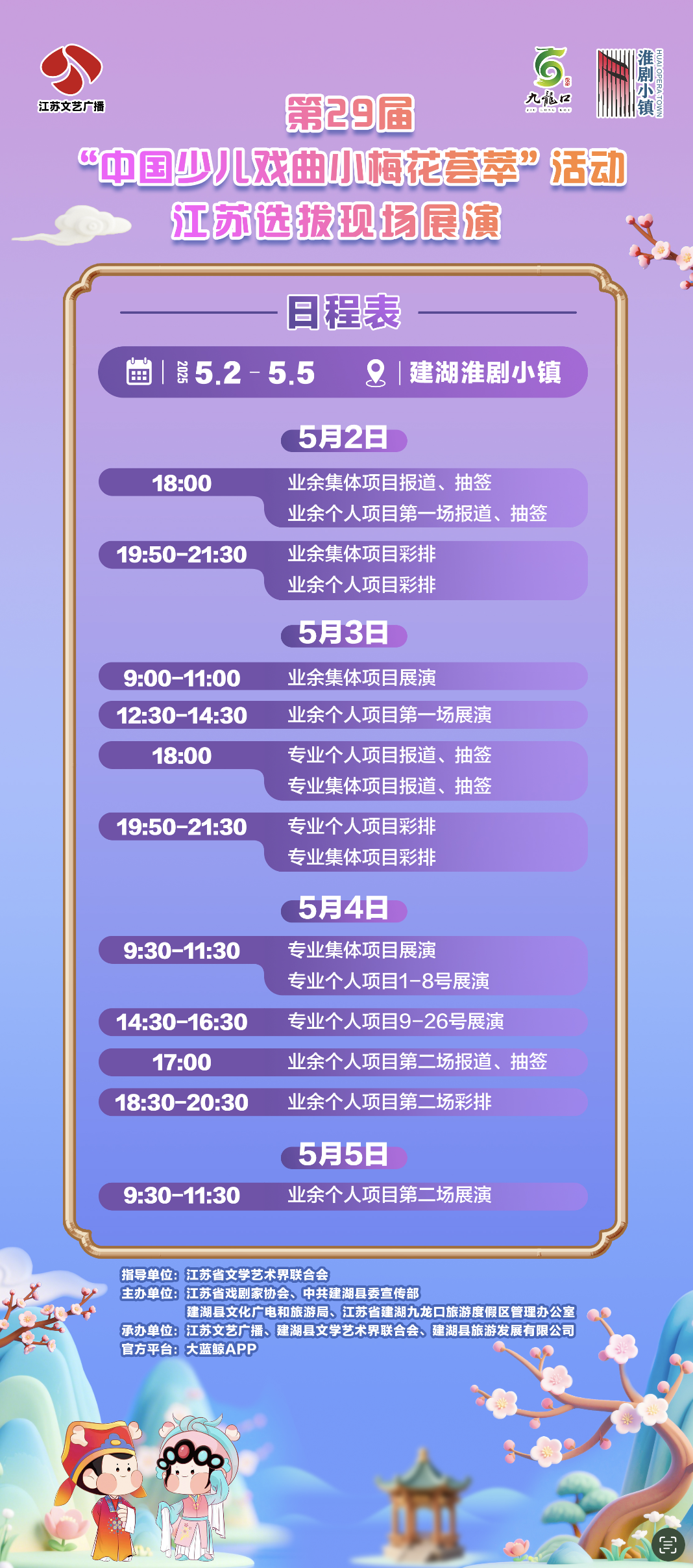 第 29 届“中国少儿戏曲小梅花荟萃”江苏选拔现场展演由江苏省文学艺术界联合会指导,江苏省戏剧家协会、中共建湖县委宣传部、建湖县文化广电和旅游局、江苏省建湖九龙口旅游度假区管理办公室主办,江苏文艺广播、建湖县文学艺术界联合会、建湖县旅游发展有限公司承办。
