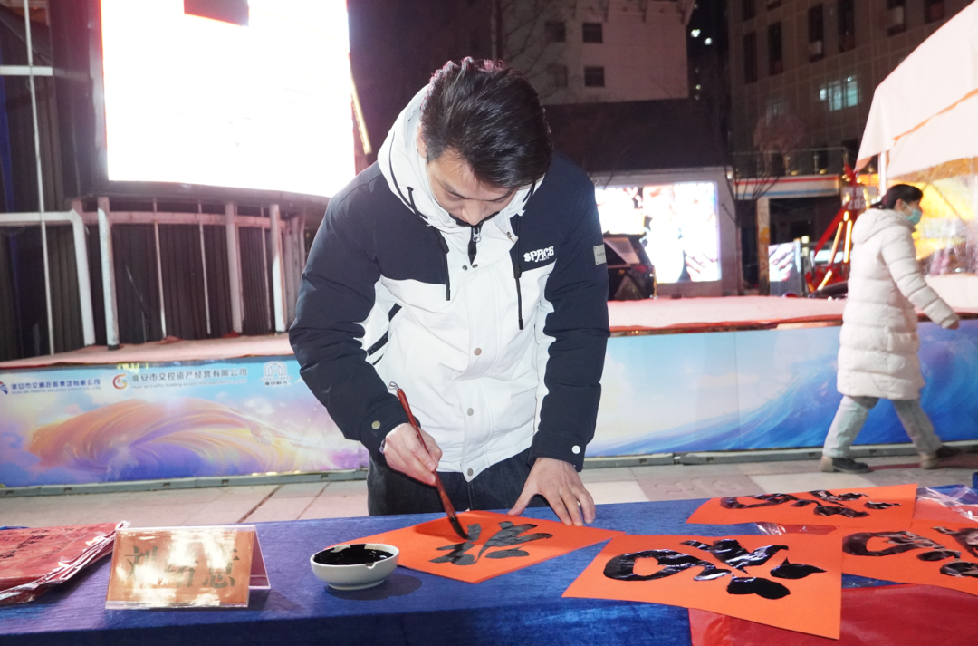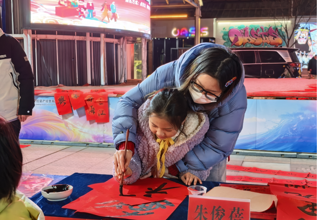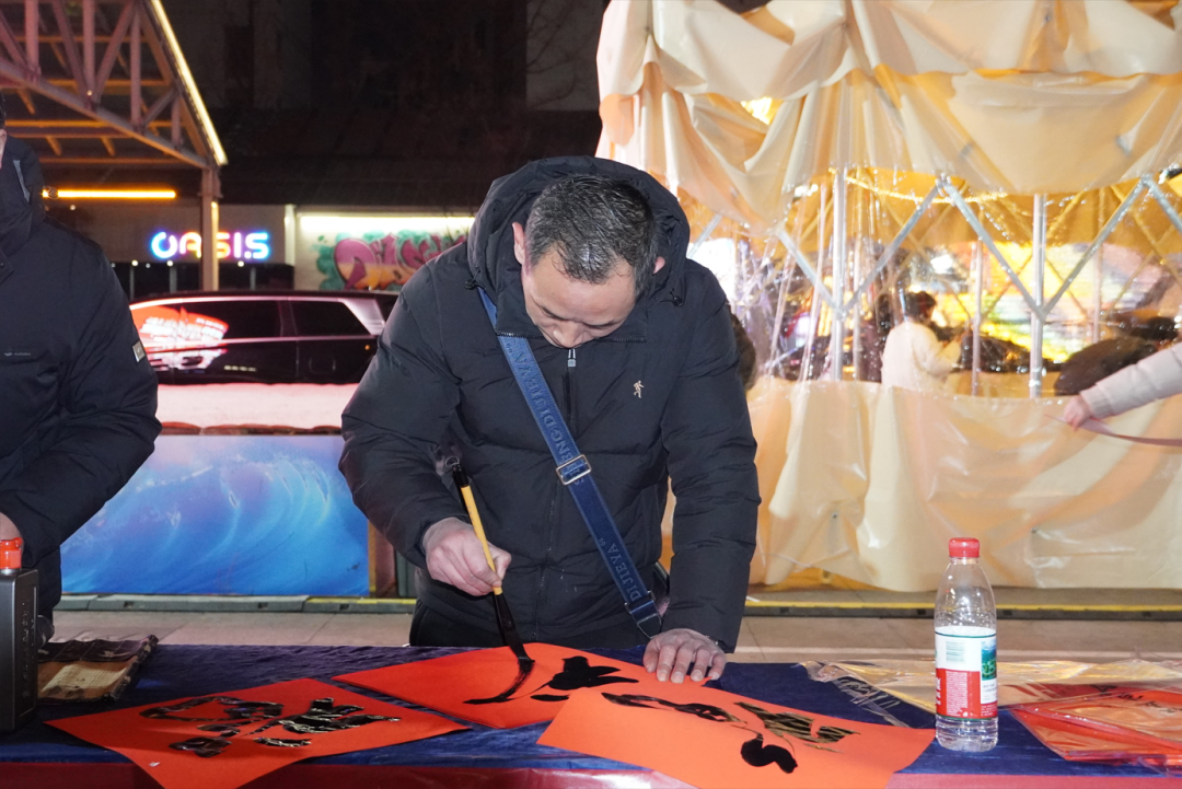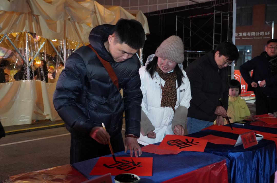 晚上天气寒冷,文创园内气氛火热。书法家们神情专注、饱蘸浓墨,笔锋流转间一幅幅春联、福字跃然于纸上,各种书体、尽显神韵,既有传统佳句,也有群众“私人订制”,现场洋溢着浓厚的年味。书法家们不光为群众书写春联福字,还手把手教感兴趣的小朋友自行创作,也在小朋友心中种下一颗艺术的种子。