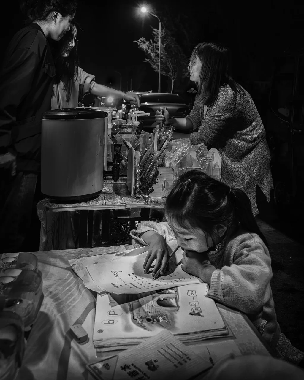 《奋斗在路灯下的母女》许伟兴 摄