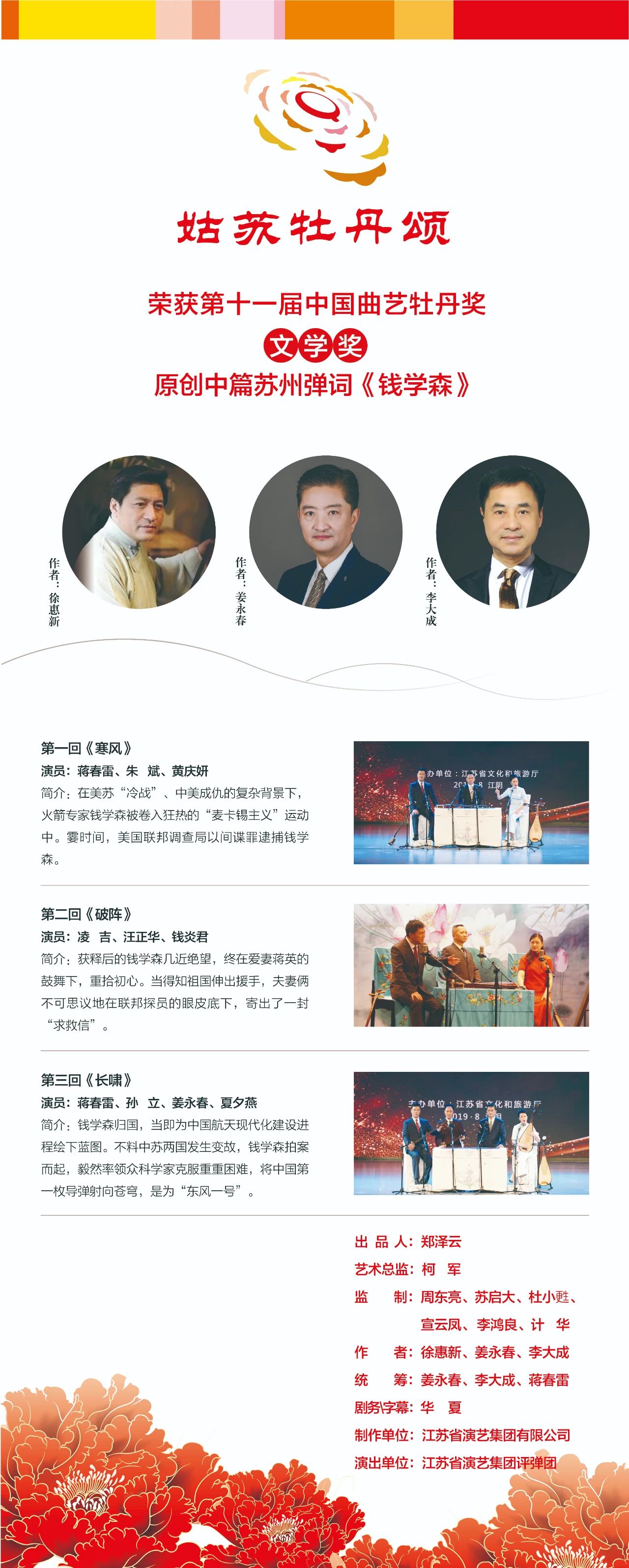 获得第十一届中国曲艺牡丹奖·文学奖的中篇苏州评弹《钱学森》,由江苏省演艺集团评弹团创演,是一部弘扬爱国主义精神的优秀文艺作品,也是一部体现新时代气息、展示中国优秀知识分子浓浓的爱国情怀和深深忧患意识的创新之作。