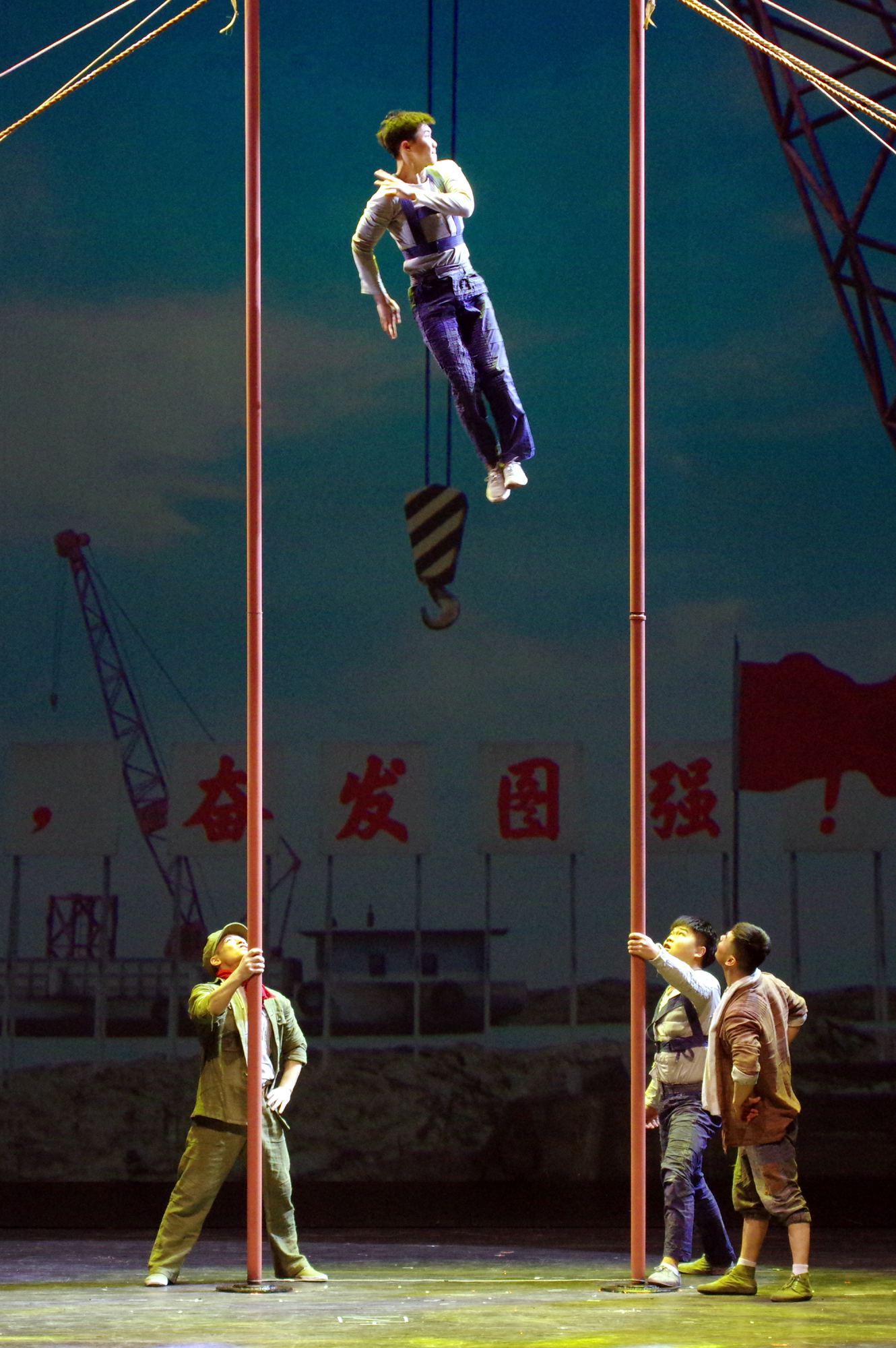题材意识是中国当代文学特有的现象,新中国成立之后,我国的现实主义文学主要分为工业题材、农业题材和革命历史题材三种潮流。工业题材主要指的是“反映工业战线,表现工业生活的作品。”这种题材由文学逐渐延伸至戏剧和影视创作领域。作为杂技舞台上难得一见的一部为南京长江大桥建设立传、为大桥建设者们立心的杂技剧,《大桥》毋庸置疑属于典型的工业题材杂技剧。工业题材的指示姿态,其实是暗含了一种创作方法,即带有高度的社会属性和政治使命的现实主义的创作方法,“庆祝中国共产党成立一百周年倾情钜献”也充分说明了这一点。《大桥》在题材方面的创新也让我再次思考了对于杂技剧而言非常重要的问题,即什么样的题材可以用杂技剧的手段来表现?怎样表现这样的题材?