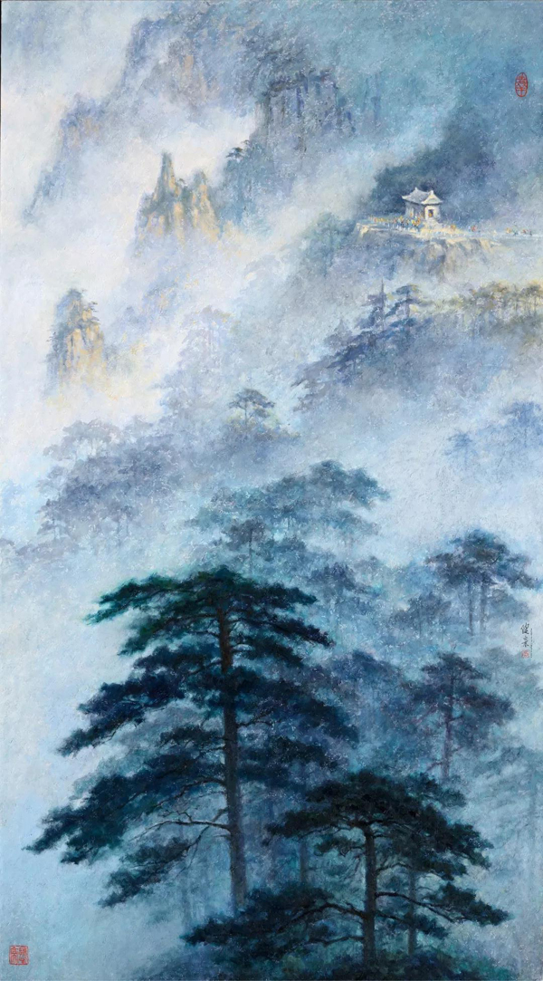 三是为时代而歌。习近平总书记在全国第十次文代会、第九次作代会上的讲话中指出:“一个时代有一个时代的文艺,一个时代有一个时代的精神。任何一个时代的经典作品,都是那个时代社会生活和精神的写照,都具有那个时代的烙印和特征。反映时代是文艺工作者的使命。”冯健亲先生正是承担起了这种使命,应时而生、与时俱进、顺时而歌。在他的作品中,不论是歌颂社会主义建设成就的《南京长江大桥》,还是展现新时期祖国河山风貌的“黄山系列”,乃至反映当下社会现实的《春天里》,他都始终以一个艺术家的眼光和感怀,满怀一腔激情,用手中的画笔反映时代、歌颂祖国、礼赞英雄、服务人民,自觉成为时代风气的先觉者、先行者和先倡者。