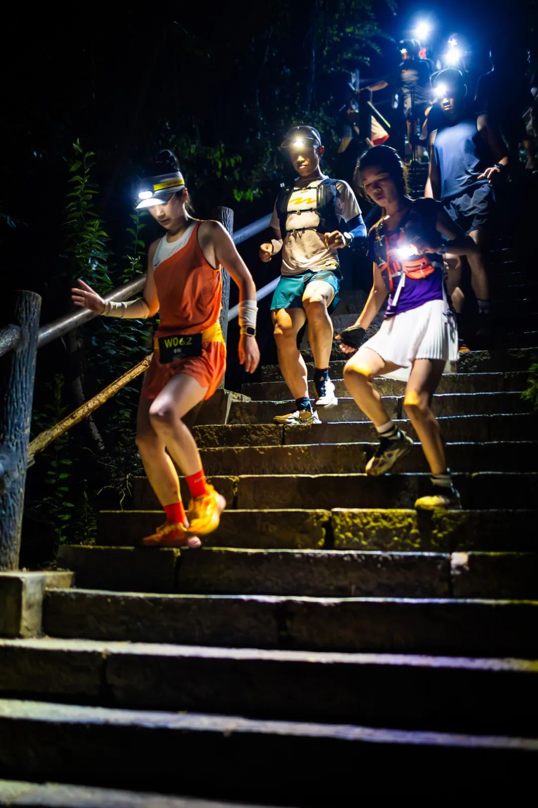 摄于2024年8月,夏日夜晚,一群戴着头灯正在参加越野登山比赛的跑团成员。