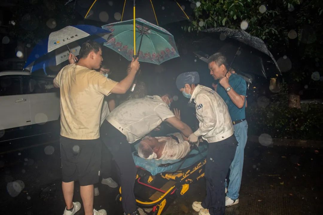 2023年9月20日晚,医务人员在大雨中搬运急诊病人。