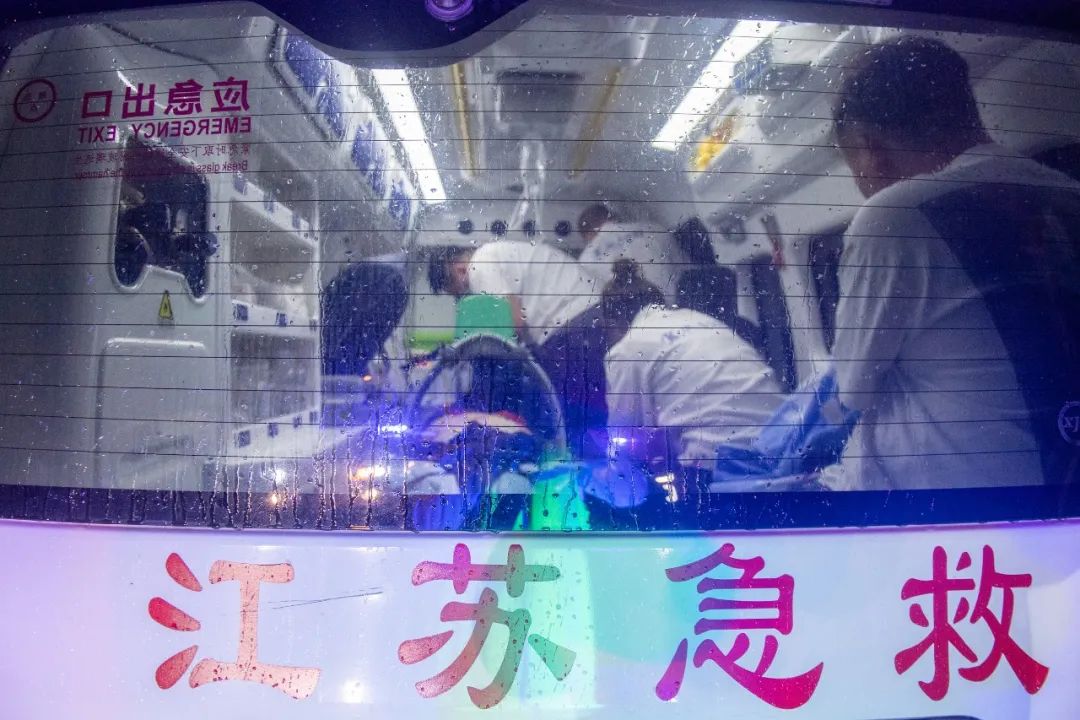 2023年11月5日,医务人员正在一辆标注着“江苏急救”字样的救护车上抢救病人。