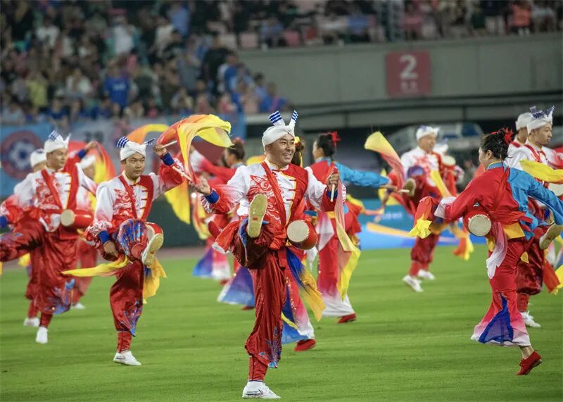 百人团队手执非遗“花香鼓”舞动。 余萍 摄
