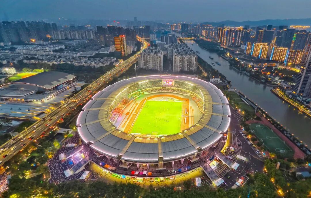 2025年9月7日晚,“苏超”第十一轮,苏州队主场迎战盐城队,夜幕下的苏州市体育中心体育场灯火璀璨。余萍 摄
