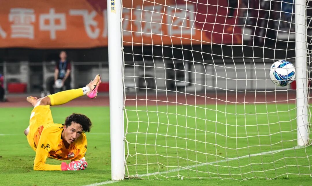 苏州队球员寇程主罚点球,被盐城队守门员扑出。吴雪 摄