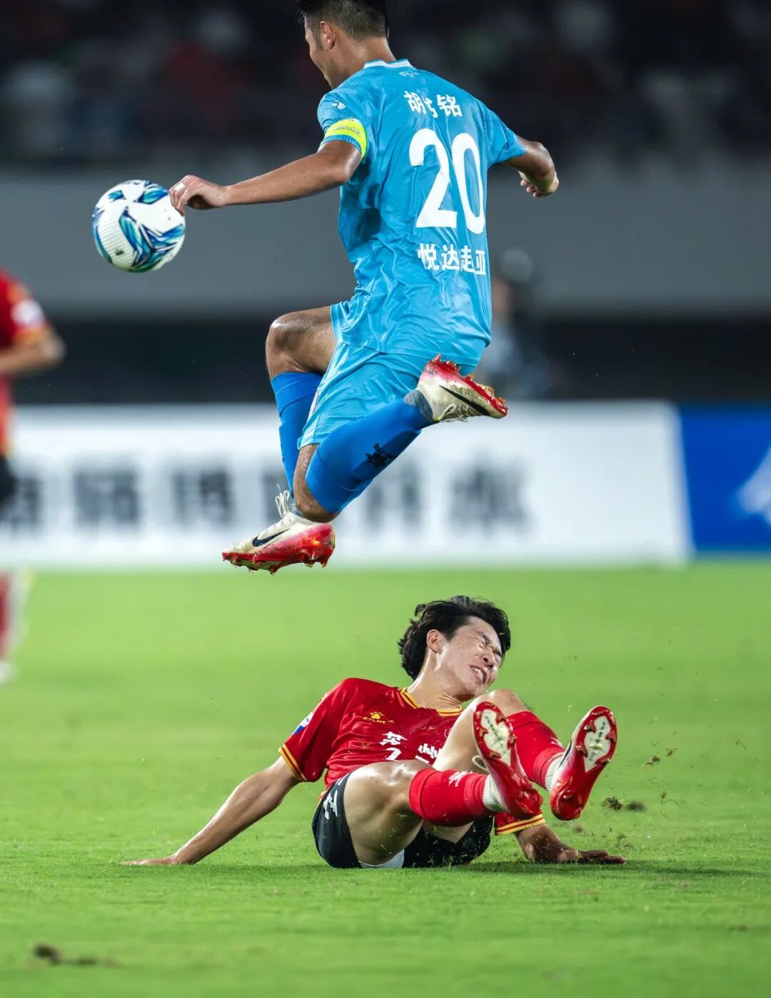 9月7日晚,“苏超”第十一轮苏州主场,盐城队20号胡书铭(蓝色球衣)腾空控球,苏州队球员(红色球衣)倒地拼抢,赛场对抗激烈。戚晓云 摄