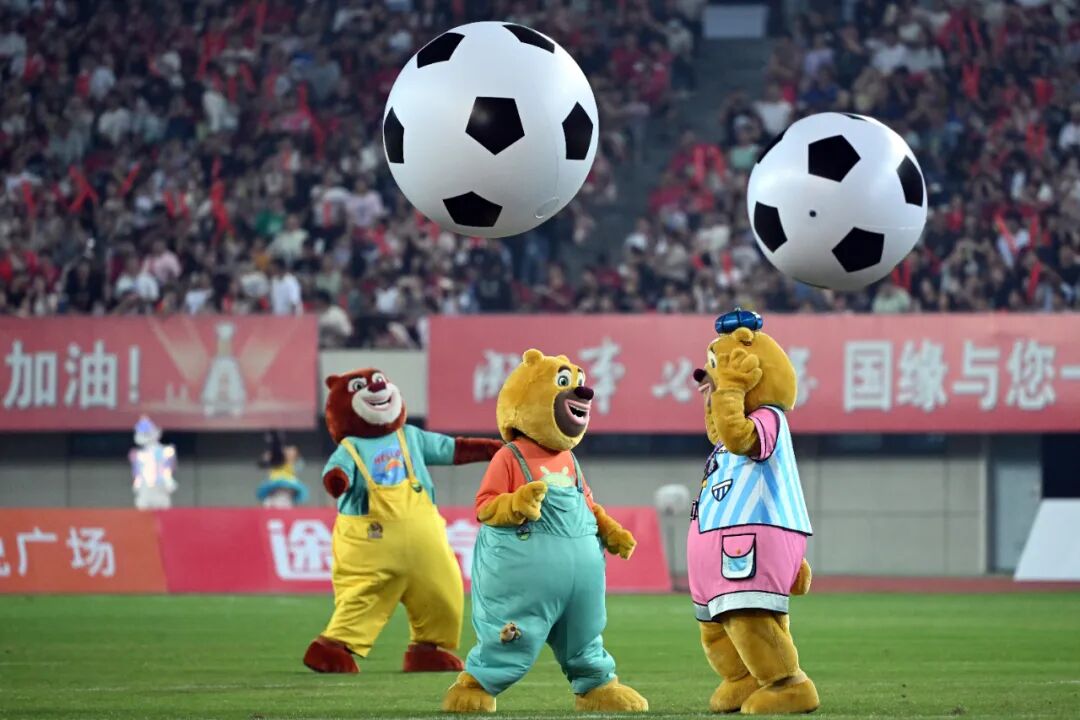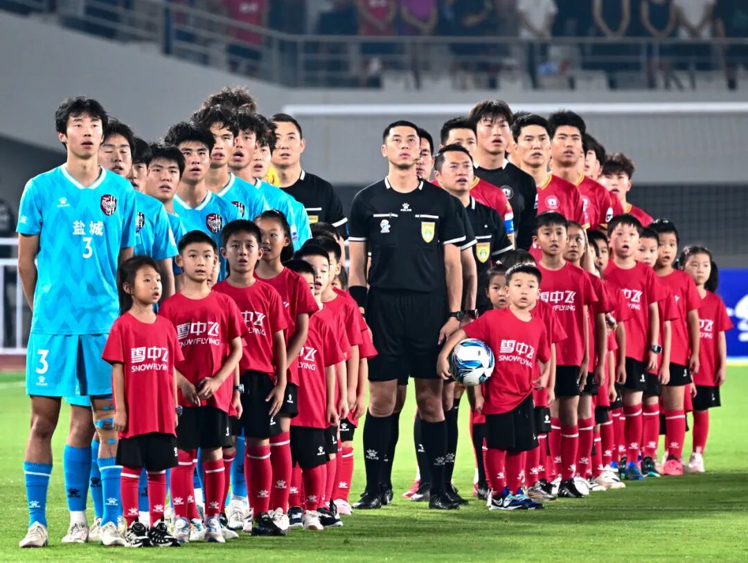 9月7日晚,“苏超”第十一轮,苏州队在苏州市体育中心体育场迎战盐城队。最终盐城队以3:2击败苏州队,积19分锁定前八。上图为开赛前的升旗仪式。余萍 摄