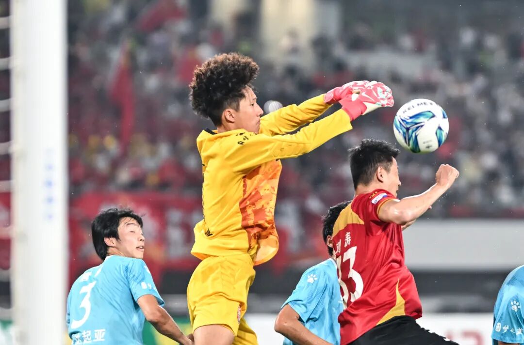 9月7日晚,“苏超”第十一轮苏州主场,盐城队28号攻门,苏州队球员滑铲、门将扑救,绿茵瞬间悬念拉满。戚晓云 摄