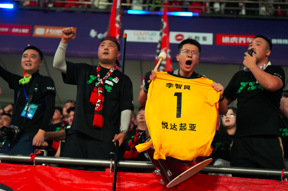 球迷拿着盐城队守门员李智良球衣欢呼。周晨阳 摄