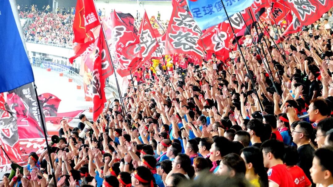 苏州的球迷举起“必胜”的战旗。纪昌盛 摄