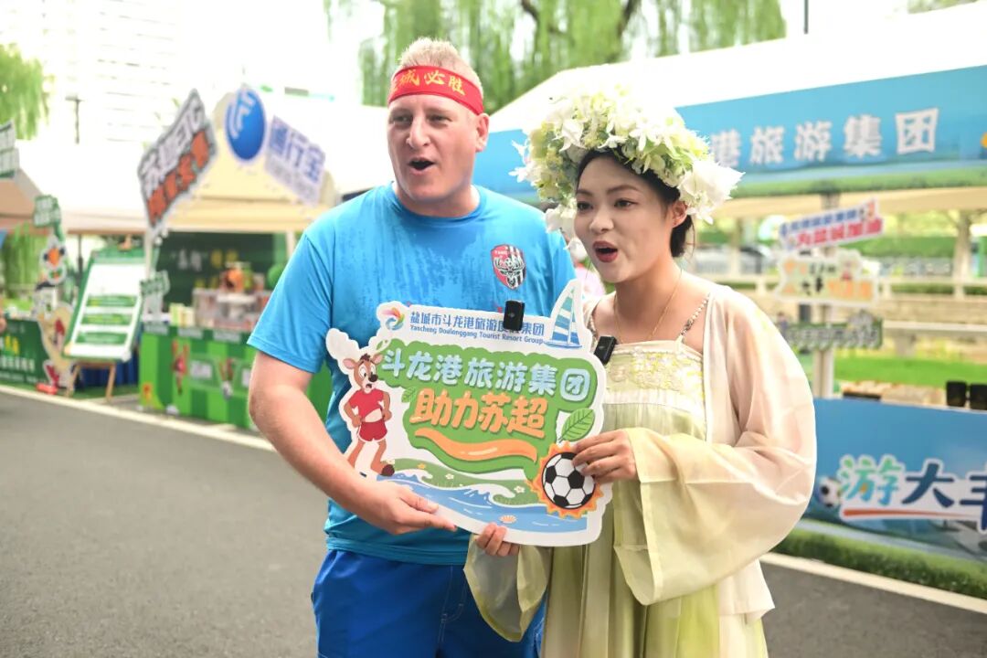 9月7日,“苏超”第十一轮,苏州队对阵盐城队赛前,一位来自澳大利亚的盐城女婿在体育场外激情助阵,为家乡呐喊助威。管钰楠 摄