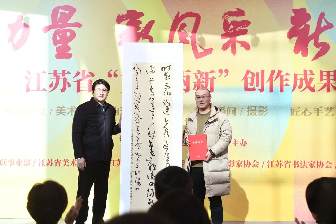 刘冠玉分享自身成长道路,以及成长道路上各级文联对“文艺两新”的关心,让他感受到“家”的温暖。两届中国书法“兰亭奖”得主陈鹏向省现代美术馆捐赠书法作品。