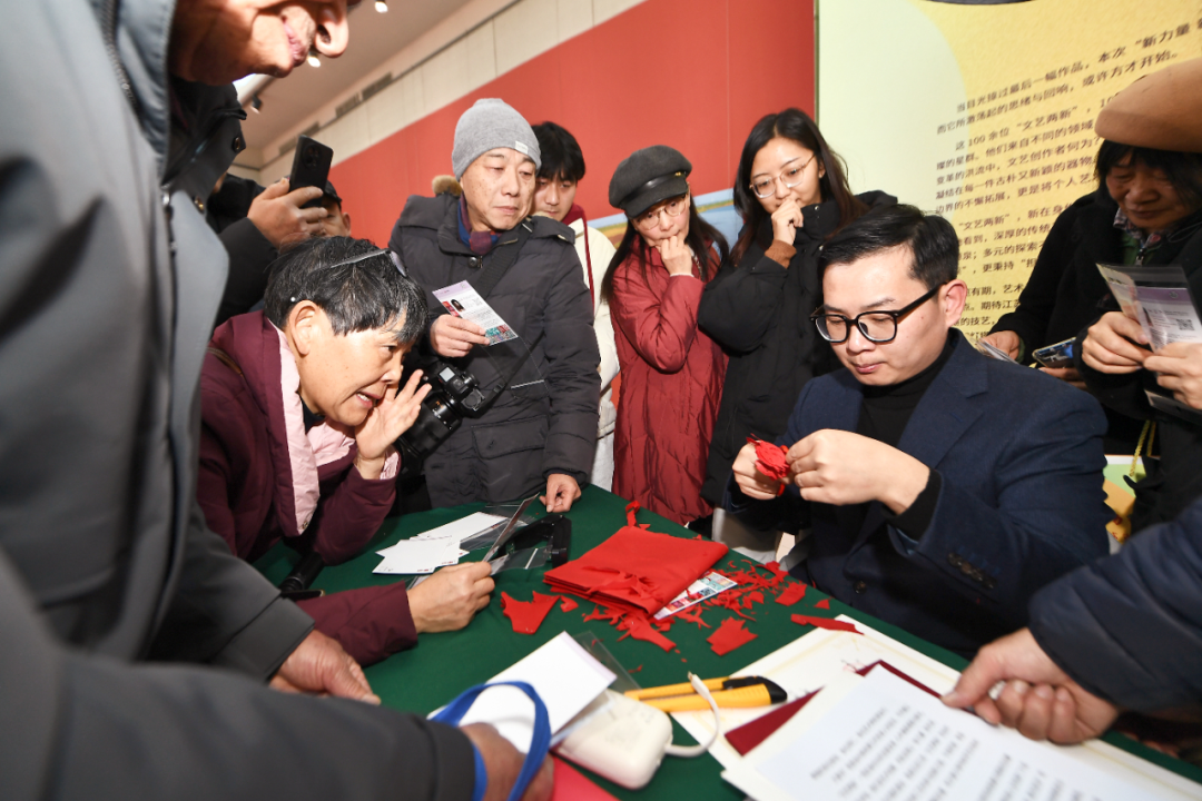 展览现场还设有多项沉浸式互动,中国民间文艺“山花奖”获得者、徐州剪纸第三代传承人刘冠玉为观众现场展示剪纸技艺并赠送剪纸小礼品,非遗金陵插花传承人茅益榛现场开展插花教学,新文艺群体书法家现场 “福”字,活动现场喜气洋洋。