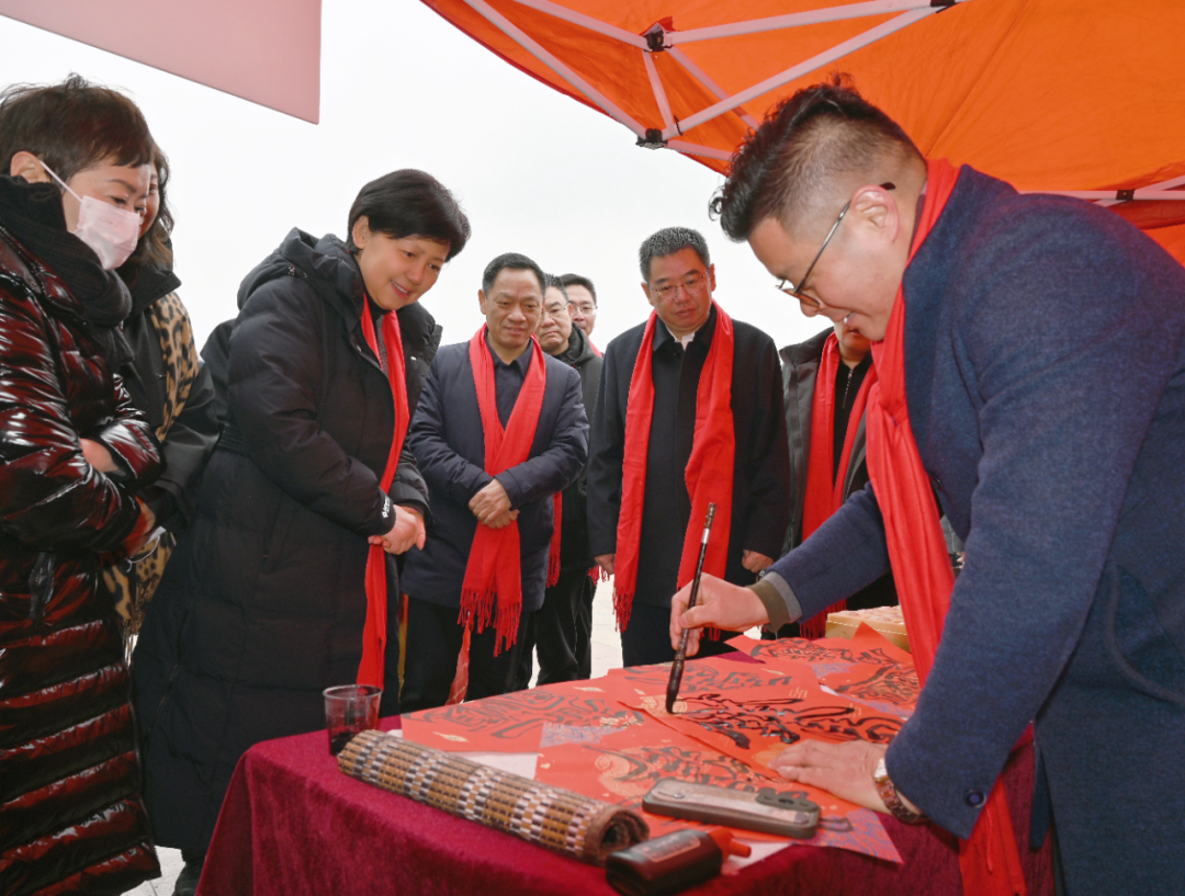 现场的“迎新春”集市上,人头攒动,气氛热烈,欢声笑语不断。十三位书法志愿者现场挥毫,书写春联和“福”字,将新春的美好期许凝于笔端。接过春联和“福”字的群众脸上洋溢着幸福的笑容,直呼这是最贴心的新春祝福。