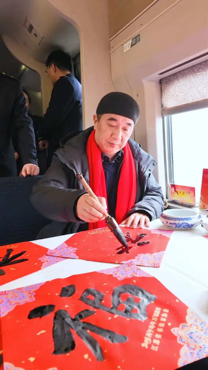 “福至运来 情满旅途——江苏省千名书法家送万福进万家”活动是中国书协“万福迎春”公益活动的重要组成部分,也是省书协持续打造的特色文化惠民品牌,迄今已连续成功举办九年,受到社会各界的高度认可和广大群众的热烈欢迎,并连续四年在中央广播电视总台新闻联播报道。除今日上午的全省联动外,后续一周省书协还将组织书法志愿者开展持续送福服务,让祝福伴随更多人的旅途。今年铁路方面再次协调长三角“超级环线”高铁列车作为新春送福专列,长三角三省一市书协组织书法名家依次登车送福,在旅途中为旅客现场创作福字春联。