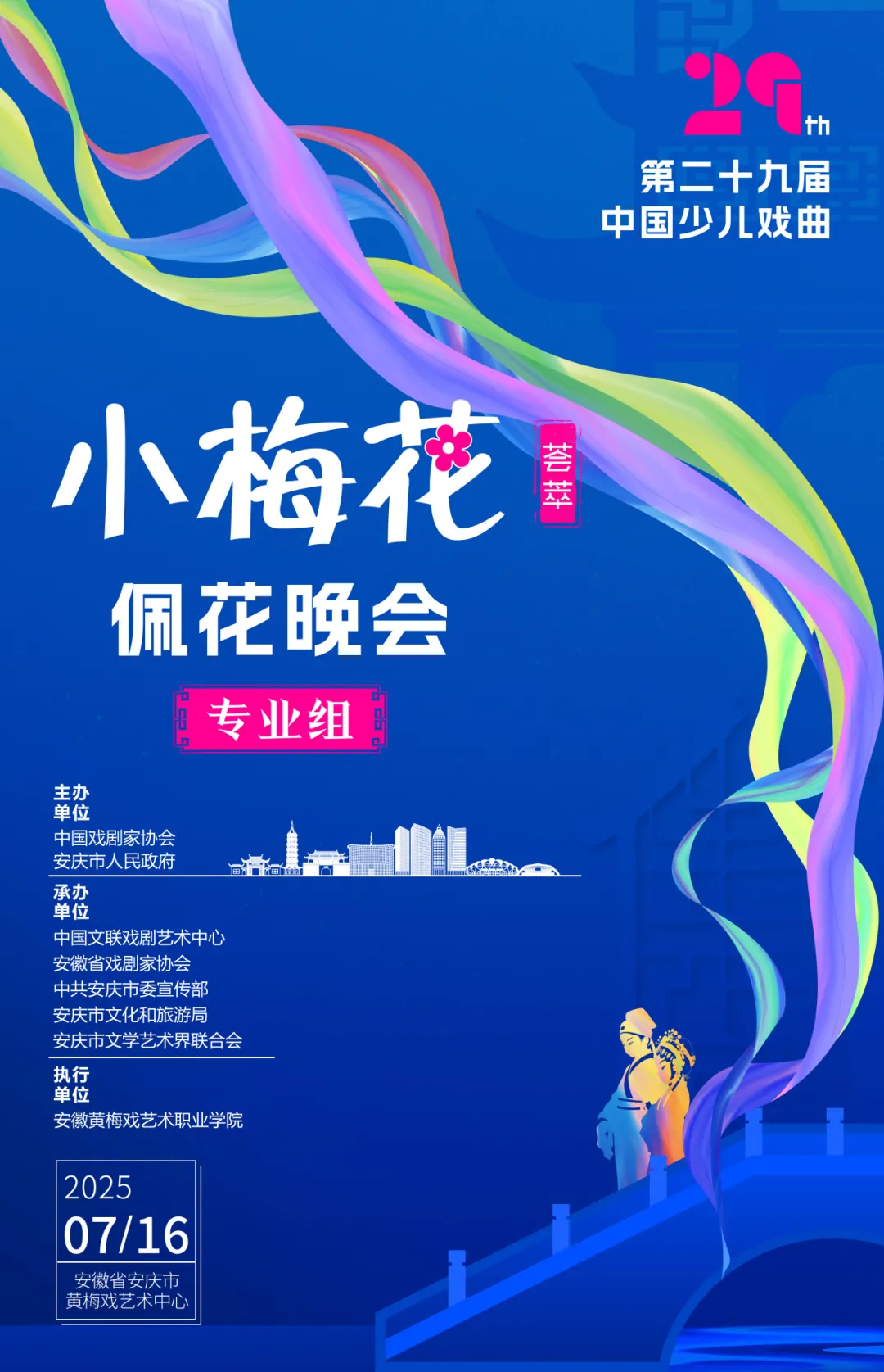 7月12日至16日,由中国戏剧家协会和安庆市人民政府主办的第29届“中国少儿戏曲小梅花荟萃”活动专业组现场展演及佩花晚会在安庆市成功举办。来自全国近1000名小演员相聚安庆,以戏为媒,以艺会友,共谱发展新篇章。我省朱韵霓、陈强、李家锐、魏家欣、吴雪菲、李洁、朱莹、扬州文化艺术学校分别带去精彩演出。