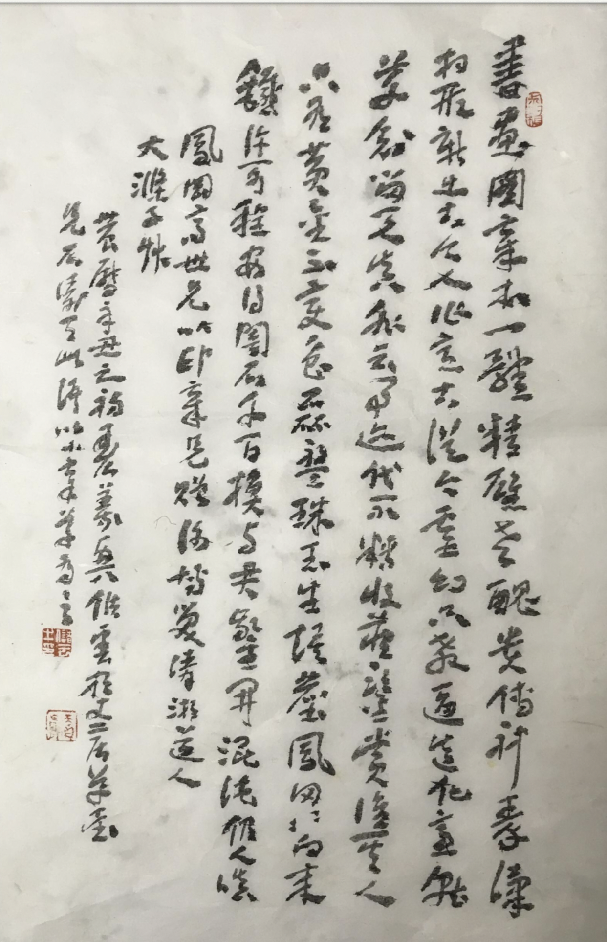 “现在回想起来,当我真正迷上了传统中国书法之后,我就一张素描也没画过,一张水粉画也没画过。虽然,这些经历对我后来的中国传统书画创作可能会有些益处,但我始终认为,中国传统书画艺术有其独特的绵延数千年的根与魂,其中的博大精深需要我们好好学习思考和实践探索。”
