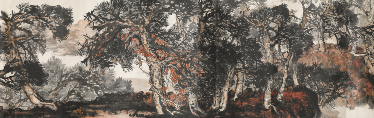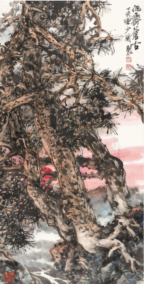 如今,邢少兰握着手中的画笔,走过了七十年的岁月。作为“自学成才”的代表画家,他笑言“学”永远在路上、在生活里,自己曾在三个月内,逆长江、过三峡,赴荆湘游峨眉青城,越剑阁览秦汉胜景,登泰山访三孔遗迹。三十余年间,他行至大江南北,遍访名山大川,广交名师益友,坚持写生创作,对山川之势与古松之姿的揣摩尤为通透。《旭霁苍古》《松下问童子》中的松树,遒劲多姿、倚侧有度;《赤壁怀古》《赤壁夜游》中的山川,雄阔秀润、浑厚苍莽……